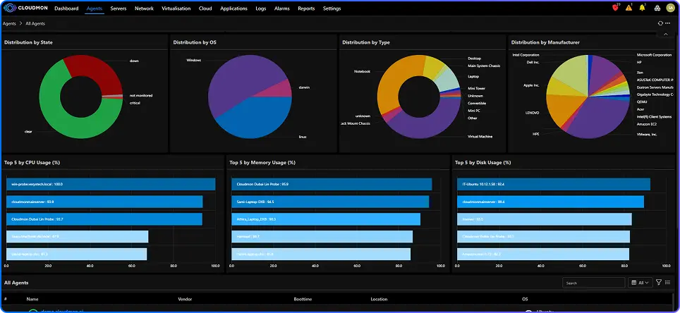 Tracks critical health metrics including CPU utilization, memory allocation, and disk I/O for both physical and virtual servers (VMware, Hyper-V) to prevent resource exhaustion.